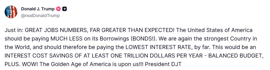 格隆汇2月11日|美国总统特朗普在社交平台发文称,“就业数据大好,远超预期!美国应在借贷成本(债券!)上支付少得多的利息!我们再次成为世界头号强国,因此理应享有迄今为止最低的利率。这将带来每年至少一万亿美元的利息支出节省——预算不仅能平衡,还能大幅盈余。哇!美国的黄金时代已至!!!”